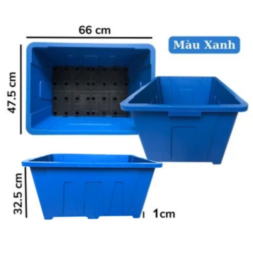 Chậu trồng rau Aquaponics Loại 1 – Trồng rau quả, cây ăn trái tại nhàChậu trồng rau Aquaponics loại 1 là chậu trồng rau, củ quả, cây ăn trái đạt chuẩn EU. Với nguyên liệu nhập từ châu Âu, chậu (khay) Aquaponics được làm từ nhựa PP đúc liền khối cao cấp, chịu va đập, chịu nhiệt cực tốt, cho độ bền sử dụng hơn 10 năm.Chậu (khay) Aquaponis chuyên dùng trong hệ thống trồng rau nuôi cá, thích hợp trồng rau củ quả, cây ăn trái lâu năm như bầu, bí, mướp, dưa lưới, nho…1. Ưu điểm của chậu trồng rau AquaponicsChậu Aquaponics có kết cấu lưới thông minh sẽ tạo độ thông thoáng, thoát nước tốt, giúp cây không bị úng nước, bạn không phải vất vả chăm bón nhưng cây vẫn xanh tốt quanh năm.Chậu trồng rau Aquaponics được làm từ nguyên liệu được nhập khẩu từ châu Âu nên sức bền, độ dẻo cao hơn, chịu được lực và môi trường cao hơn. Bề mặt chậu bóng mượt, không bị bạc màu và chống trầy xước rất tốt.Ngoài ưu việt về chất liệu, chậu (khay) Aquaponics còn được thiết kế sâu hơn, rộng hơn cùng dung tích 70 lít, chậu sẽ rộng rãi hơn, thích hợp trồng rau ăn lá, củ, quả ngắn ngày, cũng như cây ăn quả, cây leo giàn dài ngày như dưa lưới, nho, đu đủ, ổi, cóc, táo…Xem thêm: Hệ thống Aquaponics trồng rau sạch, nuôi cá tiện lợi ngay tại nhà Ngoài ra, chậu trồng rau Aquaponics chuyên trồng rau củ quả, cây ăn trái thiết kế mới có thêm chân đế cao 1cm so với mặt sàn, giúp dễ dàng vệ sinh mặt sàn hơn.Chậu trồng rau này là vật liệu không thể thiếu trong hệ thống trồng rau nuôi cá Aquaponics, đây là hệ thống trồng rau tươi cá sạch tại nhà hoàn toàn khép kín mà những dân phố dạo gần đây đang khá ưa chuộng.2. Thông tin sản phẩma. Sản phẩm có kích thướcChậu nặng 3.2kg được thiết kế siêu to, sâu, rộng, có chiều dài miệng chậu 66cm, chiều rộng miệng chậu 47.5cm, chiều cao chậu lên đến 32.5cm, thể tích chậu 70 lít cùng diện tích bề mặt trồng 0.3 mét vuông.b. Màu sắc, chất liệu chậu nhựa aquaponicChậu (khay) trồng rau Aquaponics chuyên trồng rau củ quả, cây ăn trái được sản xuất từ nhựa PP với 2 màu là màu xanh và màu ghi, cực kì an toàn cho người sử dụng và rất thân thiện với môi trường.Chất nhựa siêu đẹp và siêu dày dặn, độ dày khoảng 2mm – 3mm, cầm cực kỳ chắc tay, với độ bền hơn 10 năm và không có hạn 3. Chức năng, công dụngChậu trồng được rất nhiều loại rau ăn lá, rau ăn quả cùng lúc như bầu, bí, mướp… cũng như trồng được cả những cây có kích thước to, bộ rễ phát triển mạnh như dưa lưới, nho, đu đủ, ổi, cóc, táo…Chậu được dùng để sử dụng trong mô hình Aquaponics trồng rau nuôi cá tại nhà, cung cấp nguồn thực phẩm sạch cho cả gia đình. Thậm chí, chậu còn được sử dụng cho các mô hình Aquaponics có quy mô lớn tại các trang trại.a. Các loại rau, củ, quả, cây ăn trái phổ biến có thể trồng trong chậu AquaponicsNhóm rau ăn lá: rau muống, xà lách, cải xanh, bắp cải, cải rổ, mồng tơi, rau dền, các loại rau mùi như hành, quế, ngò… Nhóm cây họ đậu: đậu xanh, đậu nành, đậu đũa, đậu bắp, đậu phộng (lạc)…Nhóm cây lấy quả: Cà chua, ớt, cà tím,… Một số cây ăn quả như dâu tây, dưa hấu cũng phát triển tốt trong chậu (khay) Aquaponics…Nhóm cây leo lấy quả: Bầu, bí, mướp, dưa leo, dưa lê, dưa lưới, khổ qua, nho… đều có thể trồng và phát triển tốt trong chậu (khay) Aquaponics.Nhóm cây lấy củ: gừng, khoai lang, khoai ngọt, khoai mì (sắn), khoai tây, cà rốt, củ cải, củ sắn…Nhóm cây ăn trái lâu năm: mận, ổi, cóc, táo, xoài, đu đủ… hay các loại cây ăn trái có múi như cam, quýt, bưởi… hay thậm chí cả cây mía…Nhóm hoa, cây cảnh: hoa hồng, cúc hay nhiều cây cảnh khác đều có thể trồng trong chậu (khay) Aquaponics. b. Nhóm cá nước ngọt có thể nuôi trồng trong chậu AquaponicsNhóm cá da trơn: cá trê, cá tra, cá bống…Nhóm cá rô phi, điêu hồng (rô phi đỏ), cá tai tượng…Nhóm cá rô đồng, cá lóc (cá quả), cá sặc rằn…Nhóm cá chép: cá koi, cá vàng, cá chép…Một số loài khác như tôm càng xanh, baba, rùa…4. Lợi ích của hệ thống AquaponicsMột trong những lợi ích của Aquaponics là nó có thể tạo ra một hệ thống sản xuất thực phẩm thâm canh vẫn bền vững.Aquaponics bao gồm hai sản phẩm nông nghiệp (cá và rau) được sản xuất từ một nguồn nitơ (thức ăn cho cá).Aquaponics là một hệ thống cực kỳ tiết kiệm nước. Trên thực tế, chỉ cần 1/6 lượng nước để trồng lượng lương thực trên một đơn vị diện tích gấp 8 lần so với nông nghiệp truyền thống.Aquaponics không cần đất và do đó hạn chế tối đa các bệnh truyền qua đất có hại cho cây trồng.Aquaponics không yêu cầu sử dụng phân bón hoặc thuốc trừ sâu hóa học mà cây vẫn sinh trưởng, phát triển tốt.Aquaponics giúp năng suất cao hơn và chất lượng nông sản trên cả tuyệt vời.Aquaponics có nghĩa là mức độ an toàn sinh học cao hơn và rủi ro thấp hơn từ các chất gây ô nhiễm môi trư