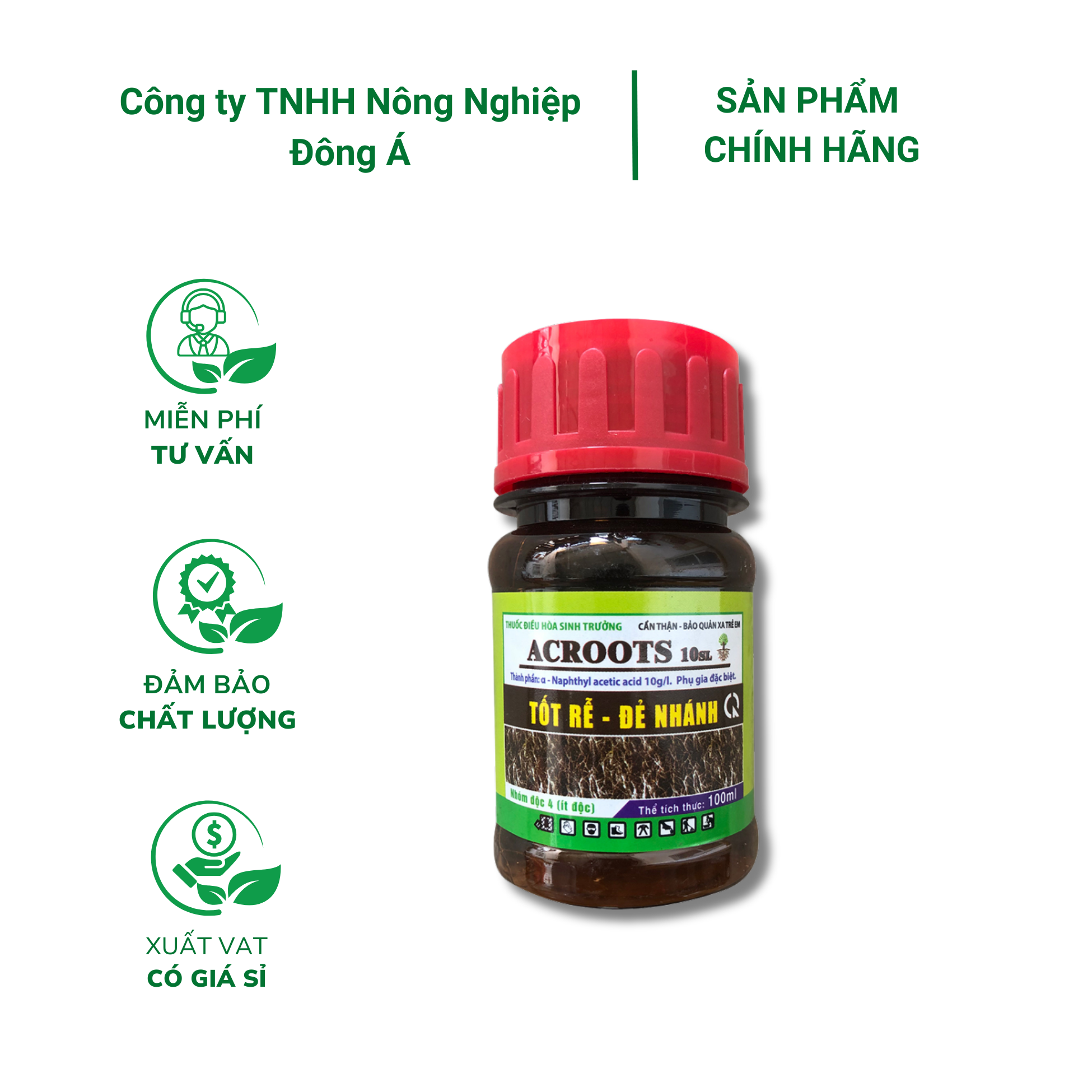 ĐIỀU HÒA SINH TRƯỞNG ACROOTRA RỄ – BẬT MẦM Mô tả: Điều hòa sinh trưởng Acroot với thành phần chính là α – Naphthyl Acetic Acid (NAA) với công dụng nổi trội chính là RA RỄ – BẬT MẦM đồng thời giúp tăng khả năng chống chịu cho cây trồng.Xuất xứ: Jichuan Guoguang Agrochemical Co.,ltđ, Trung QuốcPhân phối: Công ty TNHH Nông Nghiệp Đông ÁQuy cách: chai 100mlThành phần: α – Naphthyl Acetic Acid 10g/L. Phụ gia đặc biệt.Hướng dẫn sử dụng: ACROOTS 10 SL chứa Auxin α – NAA có công kích thích ra rễ cực mạnh, đẻ nhánh nhiều, mập mầm, xanh cây, xanh lá… Thích hợp cho mọi giai đoạn phát triển của cây trồng, đặc biệt là khi cây trải qua giai đoạn tổn thương của bộ rễ như cây non, cây mới trồng, giai đoạn điều kiện thời tiết bất lợi (hạn hán, ngập úng, ngộ độc hữu cơ…)• Cây non: 10ml/16 Lít (1 nắp = 25ml)• Cây trưởng thành: 15-20ml/16 LítBảo quản: + Bảo quản nơi khô ráo, thoáng mát+ Để xa tầm tay trẻ, nguồn thực phẩm, nguồn nướcMột số lưu ý: + Mặc đồ bảo hộ lao động khi phun hóa chất+ Không ăn uống và hút thuốc khi pha chế và phun hóa chất+ Tránh hít phải hơi hóa chất+ Không đổ hóa chất thừa làm ô nhiễm nguồn nước, ao hồ+ Nếu dính da: rửa với thật nhiều nước và xà phòng+ Nếu dính mắt: rửa với vòi nước chảy trong vòng 10-15 phút+ Nếu nuốt: phải đưa nạn nhân đến cơ quan y tế gần nhất kèm theo nhãn sản phẩm
