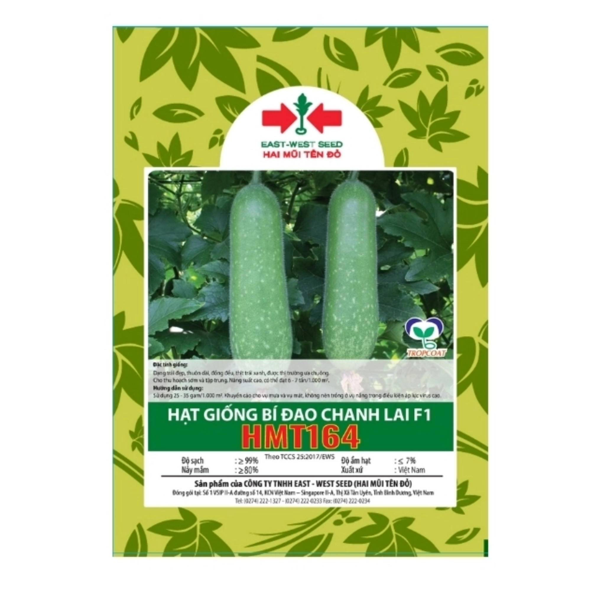 HẠT GIỐNG BÍ ĐAO CHANH LAI F1 HMT164 Mô tả: Hạt giống bí đao chanh lai F1 HMT164 là giống bí đao có dạng trái đẹp, thuôn dài, đồng đều, thịt trái xanh, được thị trường ưa chuộng. Cho thu hoạch sớm và tập trung. Năng suất cao, có thể đạt 6-7 tấn/1000m2.Xuất xứ: CÔNG TY TNHH EAST- WEST SEED (HAI MŨI TÊN ĐỎ)Quy cách đóng gói: Gói 22 hạt.Một số thông tin• Độ sạch (P): ≥ 99%• Tỷ lệ nảy mầm (G): ≥ 80%• Độ ẩm (H): ≤ 7% Đặc tính giống • Dạng trái đẹp, thuôn dài, đồng đều, thịt trái xanh, được thị trường ưa chuộng. • Cho thu hoạch sớm và tập trung. Năng suất cao, có thể đạt 6-7 tấn/1000m2.Hướng dẫn sử dụng• Sử dụng 25 – 35 gram/1000m2. • Khuyến cáo cho vụ mưa và vụ mát, không nên trồng ở vụ nắng trong điều kiện áp lực virus cao. Hướng dẫn bảo quản• Bảo quản hạt giống nơi khô ráo, không để trực tiếp dưới ánh nắng hoặc nơi có nhiệt độ cao.• Chất lượng hạt giống tốt nhất khi bao bì còn nguyên vẹn.Nông Nghiệp Phố – chuỗi cửa hàng chuyên cung cấp hạt giống uy tín với hơn 1000+ loại giống.➤ Website: https://nongnghieppho.vn/➤ Hotline: 0865 399 086