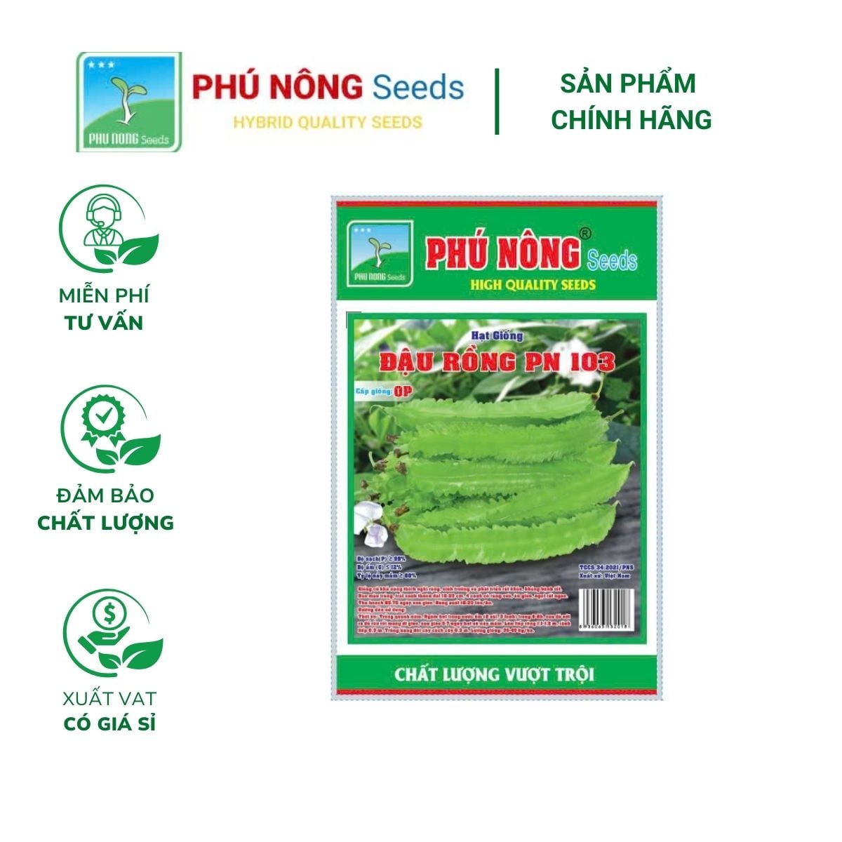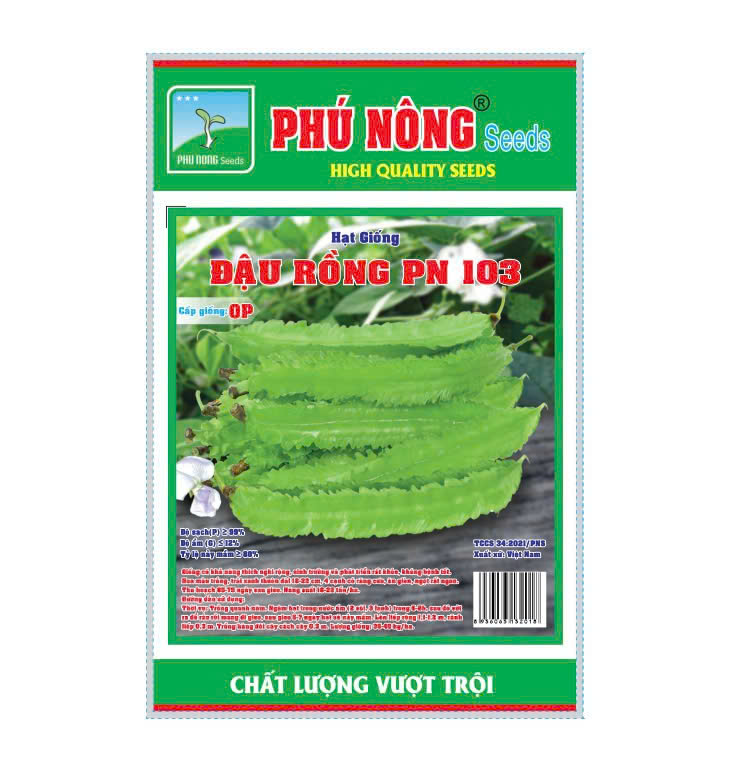 HẠT GIỐNG ĐẬU RỒNG CAO SẢN PN-103 Mô tả sản phẩm: Đậu rồng dễ trồng và không mất nhiều công chăm sóc. Người trồng không hề phải phun thuốc vì loại rau này ít bệnh. Trồng đậu rồng có thể làm giàn leo, vừa lấy bóng mát vừa lấy quả ăn. Đậu rồng có giá trị dinh dưỡng, có nhiều vitamin E và A.Xuất xứ: Việt Nam.Sản phẩm của: Công ty Giống Cây Trồng Phú Nông.Quy cách: 10 gram.Một số tiêu chuẩn: • Độ sạch: ≥98%• Tỉ lệ nảy mầm: ≥85%• Độ ẩm: ≤10%• Thời gian thu hoạch: 65 – 70 ngày.Lợi ích của Đậu Cao Sản PN: • Đậu rồng có hàm lượng canxi cao nhất trong số tất cả các loại đậu và vì vậy, rất có lợi cho khung xương của con người. Sự có mặt của canxi trong các loại đậu giúp trong việc sản xuất và bảo trì hệ thống xương cốt và cung cấp sức mạnh để vượt qua bệnh tật và phòng chống loãng xương.• Đậu rồng cũng là một nguồn khoáng sản tự nhiên, cung cấp cho con người rất nhiều vitamin (A,C), là những vitamin giúp gia tăng sức đề kháng và chống lão hóa tế bào, Fe giúp phòng chống thiếu máu, và nhiều men tiêu hóa thiên nhiên có lợi cho sức khỏe.• Là một cây họ đậu nên đậu rồng chứa hàm lượng cao protein và vì vậy có có thể thay thế cho protein từ động vật, tốt cho người ăn chay và phòng bệnh suy dinh dưỡng.Hướng dẫn cách gieo hạt: • Khi mua hạt giống về, mọi người cần ngâm hạt giống trong nước ấm (2 phần nước sôi, 3 phần nước lạnh) khoảng 6 – 8 tiếng• Sau đó, vớt hạt ra và ngâm trong khăn ẩm rồi quấn lại vào túi nilon, cột chặt sau đó bỏ vào thùng xốp hoặc nhựa kín. Đóng nắp lại và ủ đêm 24h.Hướng dẫn bảo quản:• Hàng có giá trị khi bao bì còn nguyên vẹn.• Bảo quản nơi khô ráo, thoáng mát.Nông Nghiệp Phố – chuỗi cửa hàng chuyên cung cấp hạt giống uy tín với hơn 1000+ loại giống.➤ Website: https://nongnghieppho.vn/➤ Hotline: 0865 399 086