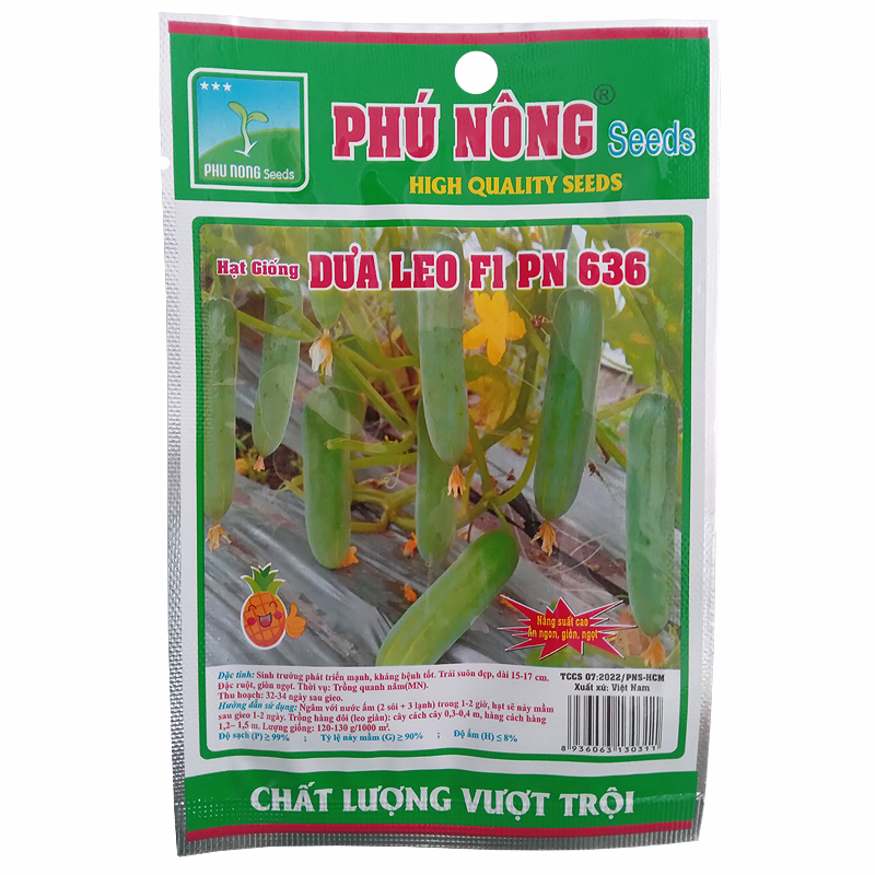 Hạt giống Dưa Leo Siêu Năng Suất Mô tả: Hạt giống Dưa leo siêu năng suất sinh trưởng phát triển mạnh, kháng bệnh tốt. Trái suôn đẹp, dài 15-17 cm. Đặc ruột, giòn ngọt, có thể trồng được quanh năm. Thu hoạch 32-34 ngày sau gieo.Sản phẩm của: Công ty giống cây trồng Phú Nông.Trọng lượng: 1 gramChỉ tiêu chất lượng- Độ sạch: ≥99%- Tỉ lệ nảy mầm: ≥90%- Độ ẩm: ≤8%Hướng dẫn sử dụngNgâm với nước ấm (2 sôi + 3 lạnh) trong 1-2 giờ, hạt sẽ nảy mầm sau gieo 1-2 ngày.Trồng hàng đôi (leo giàn): cây cách cây 0.3-0.4 m, hàng cách hàng 1.2-1.5 m.Lượng giống: 120-130 g/ 1000 m2.Kỹ thuật trồngVật liệu trồngChậu trồng có đường kính và chiều sâu tối thiểu 20cm. Đất trồng rau ăn củ quả.Gieo trồngNgâm ủ hạt giống trước khi gieo.Cho đất vào chậu, tưới ẩm. Tạo lỗ sâu khoảng 0.5cm, gieo 1 hạt/ lỗ. Mỗi chậu nên gieo 2 hạt để khi cây lớn chọn giữ lại cây khỏe nhất. Phủ lớp đất mỏng che kín hạt.Tưới nước giữ ẩm thường xuyên cho hạt nảy mầm. Có thể ươm cây con trong bầu/ chậu nhỏ đến khi được 2-3 lá thật thì đưa ra chậu trồng.Chăm sócTưới nước 1 hoặc 2 lần/ ngày tùy độ ẩm đất trồng và thời tiết. Sử dụng phân theo đúng chỉ dẫn, tùy loại phân có thể bón gốc hoặc tưới qua lá. Cây cao khoảng 10cm (trước khi cây ra tua cuốn) thì làm giàn cho dây leo.Nên sử dụng chế phẩm sinh học để phòng trừ sâu bênh hại.Hướng dẫn bảo quảnBảo quản nơi khô ráo, thoáng mát.Hàng có giá trị khi bao bì nguyên vẹn.