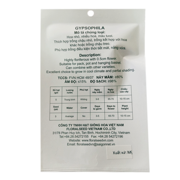 Hạt giống hoa baby FVN Mô tả sản phẩmHạt giống hoa baby FVN là giống hoa sinh trưởng và phát triển tốt. Với đặc trưng là vô vàn những hoa nhỏ, xinh linh lung với nhiều màu sắc tưới tắn, rực rỡ. Hoa thích hợp để trồng trong những chậu nhỏ, hay kết hợp trồng chung nhiều loại hoa khác hoặc trồng chậu treo đều rất đẹp.Đặc điểm thực vật của hoa babyHoa baby có vẻ ngoài nhỏ xíu như những bông tuyết, cùng mùi thơm thoang thoảng, dễ chịu. Hoa baby thuộc loài thân bụi, cây thường phân nhiều cành, phía đầu cành sẽ cho những hoa nhỏ xinh tươi.Ý nghĩa của hoa baby• Hoa baby tượng cho tình yêu tinh khiết, sự trong trắng, mỏng manh, thanh tao như chính vẻ ngoài của hoa mang lại.• Ngoài ra, trong cuộc sống hoa baby có ý nghĩa gắn kết yêu thương, thể hiện tình cảm dành cho gia đình.Xuất xứHạt giống hoa baby FVN có xuất xứ từ Mỹ, và là sản phẩm của Công Ty Hạt Giống Hoa Việt Nam FLORALSEEDS – một trong ba công ty chuyên về hạt giống hoa tốt nhất tại Việt Nam.Quy cách đóng góiMột gói hạt giống hoa baby FVN sẽ có 5 hạt giống bên trong.Một số thông tin• Độ sạch (P): ≥ 98%.• Tỷ lệ nảy mầm (G): ≥ 80%.• Độ ẩm (H): ≤ 15%.Hướng dẫn sử dụng• Thời vụ trồng: Cây dễ trồng, dễ chăm sóc, có thể trồng quanh năm, phù hợp trồng điều kiện thời tiết mát.• Hạt giống sau khi mua về, bạn tiến hành ươm vào khay ươm giống chuyên dụng hặc bạn có thể ươm bằng viên nén xơ dừa. Hàng ngày tưới nước 1 – 2 lần để giữ ẩm, sau 3 – 5 ngày, hạt giống sẽ nảy mầm.• Chiều cao cây: 10cm – 15cm.• Thời gian sang chậu kể từ ngày gieo hạt: 25 – 30 ngày.• Thời gian ra hoa đầu tiên: 65 – 70 ngày.Lưu ý• Chất lượng hạt giống tốt nhất khi bao bì còn nguyên vẹn.• Bảo quản nơi khô ráo, thoáng mát, không để trực tiếp dưới ánh nắng mặt trời hoặc nơi có nhiệt độ cao.Nông Nghiệp Phố – chuỗi cửa hàng chuyên cung cấp hạt giống uy tín với hơn 1000+ loại giống. ➤ Website: https://nongnghieppho.vn/➤ Hotline: 0865 399 086