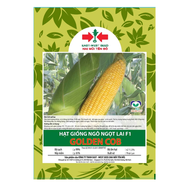 Hạt giống Ngô ngọt, Bắp Mỹ Golden CobMô tả: Hạt giống Ngô ngọt, Bắp Mỹ Golden Cob có độ nảy mầm cao, cây sinh trưởng khỏe, vị trí đóng trái thấp, ít đổ ngã. Lá bi xanh. Trái to. Trọng lượng trung bình 500 – 550 gram/trái. Hạt đóng đầy cùi, thẳng hàng, chất lượng ăn ngon, mềm và ngọt. Thu hoạch 66 – 68 ngày sau gieo. Thích hợp cho ăn tươi và chế biến. Xuất xứ: CÔNG TY TNHH EAST- WEST SEED (HAI MŨI TÊN ĐỎ)Quy cách đóng gói: Gói 70 hạt Một số thông tin• Độ sạch (P): ≥ 99%• Tỷ lệ nảy mầm (G): ≥ 80%• Độ ẩm (H): ≤ 11.5% Đặc tính giống • Cây sinh trưởng khỏe, vị trí đóng trái thấp, ít đổ ngã. • Lá bi xanh. Trái to. • Trọng lượng trung bình 500 – 550 gram/trái.• Hạt đóng đầy cùi, thẳng hàng, chất lượng ăn ngon, mềm và ngọt. • Thích hợp cho ăn tươi và chế biến. Hướng dẫn sử dụng• Khoảng cách gieo trồng: 75cm x 25cm. Lượng hạt gieo: 5-6 kg/ha.• Khuyến cáo: để tỷ lệ nảy mầm tốt hơn, bà con nên gieo khô. • Chú ý: bố trí màu vụ gieo trồng để tránh trổ cờ phun râu vào thời điểm có nhiệt độ quá cao > 35 độ C hoặc quá thấp < 15 độ C.Hướng dẫn bảo quản• Bảo quản hạt giống nơi khô ráo, không để trực tiếp dưới ánh nắng hoặc nơi có nhiệt độ cao.• Chất lượng hạt giống tốt nhất khi bao bì còn nguyên vẹn.Nông Nghiệp Phố – chuỗi cửa hàng chuyên cung cấp hạt giống uy tín với hơn 1000+ loại giống.➤ Website: https://nongnghieppho.vn/➤ Hotline: 0865 399 086