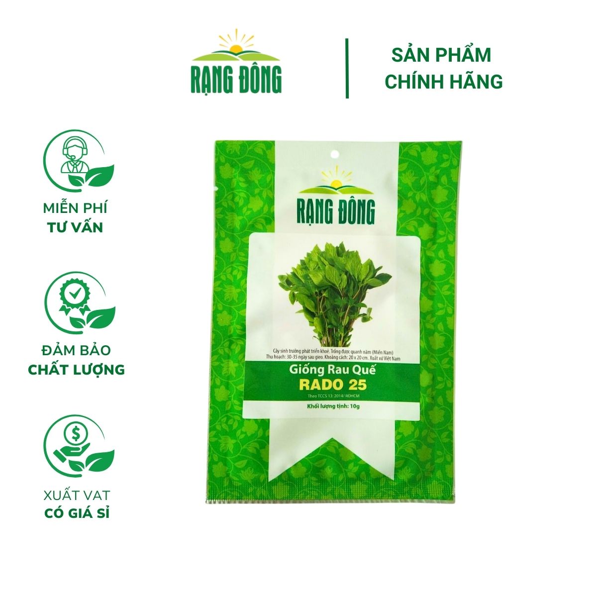 HẠT GIỐNG RAU HÚNG QUẾ LÁ TO RADO 25 Mô tả sản phẩmHạt giống Rau húng quế Rado 25 là giống sinh trưởng và phát triển mạnh, cây lớn, lá lớn, tròn, dài. Thân có màu tím, lá màu xanh mướt, có mùi thơm dễ chịu. Trồng quanh năm. Thu hoạch 30-35 ngày sau khi gieo. Xuất xứ: CÔNG TY TNHH MTV HẠT GIỐNG RẠNG ĐÔNGQuy cách đóng gói: Gói 10 gram.Một số thông tin • Tỷ lệ nảy mầm: >85%.• Ðộ sạch: >99%.• Độ ẩm: <10%.Hướng dẫn cách trồng 1/ Đất trồng • Đất sạch giàu dinh dưỡng trộn với các giá thể như trấu, mụn dừa, phân trùn quế…theo tỷ lệ 7:3 hoặc dùng đất sạch đóng bao sẵn. • Làm đất tơi xốp, thoát nước tốt, bề mặt đất được làm bằng phẳng để gieo hạt cho đồng đều. 2/ Gieo hạt • Ngâm hạt giống trong nước ấm theo tỷ lệ 2 sôi 3 lạnh khoảng từ 2-3 tiếng, sau đó ủ qua đêm để nứt hạt nahnh nảy mầm hơn.• Tiến hành gieo hạt giống trực tiếp trên mặt đất, sau đó phủ một lớp đất mỏng lên trên. • Nên gieo hạt giống đều tay, mật độ trồng hàng cách hàng 25-30cm, cây cách cây 20-25cm. Lượng giống cần thiết cho 1000m2 là 60-70g. • Khi cây bắt đầu ra lá thì bón cho cây bằng các loại phân hữu cơ, phân trùn quế hoặc phân chuồng. • Khoảng 2 tuần thì bắt đầu bón thúc 1 tuần một lần. • Tưới 2 lần mỗi ngày vào sáng sớm và chiều tối. Hướng dẫn bảo quản• Bảo quản hạt giống nơi khô ráo, không để trực tiếp dưới ánh nắng hoặc nơi có nhiệt độ cao.• Chất lượng hạt giống tốt nhất khi bao bì còn nguyên vẹn.Nông Nghiệp Phố – chuỗi cửa hàng chuyên cung cấp hạt giống uy tín với hơn 1000+ loại giống.➤ Website: https://nongnghieppho.vn/➤ Hotline: 0865 399 086